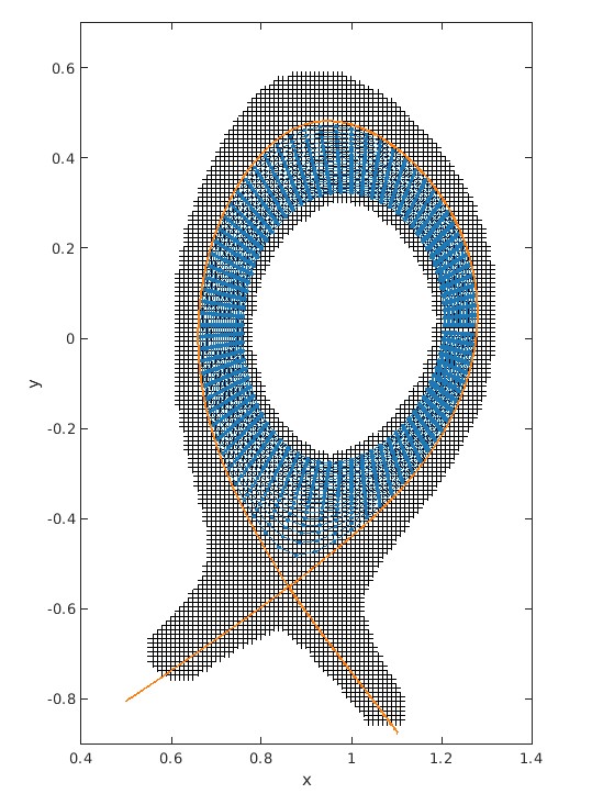 Polar grid (blue) defined on the closed field line region, with the Cartesian mesh shown as black crosses. The separatrix (orange) is shown for reference and not part of the polar mesh.