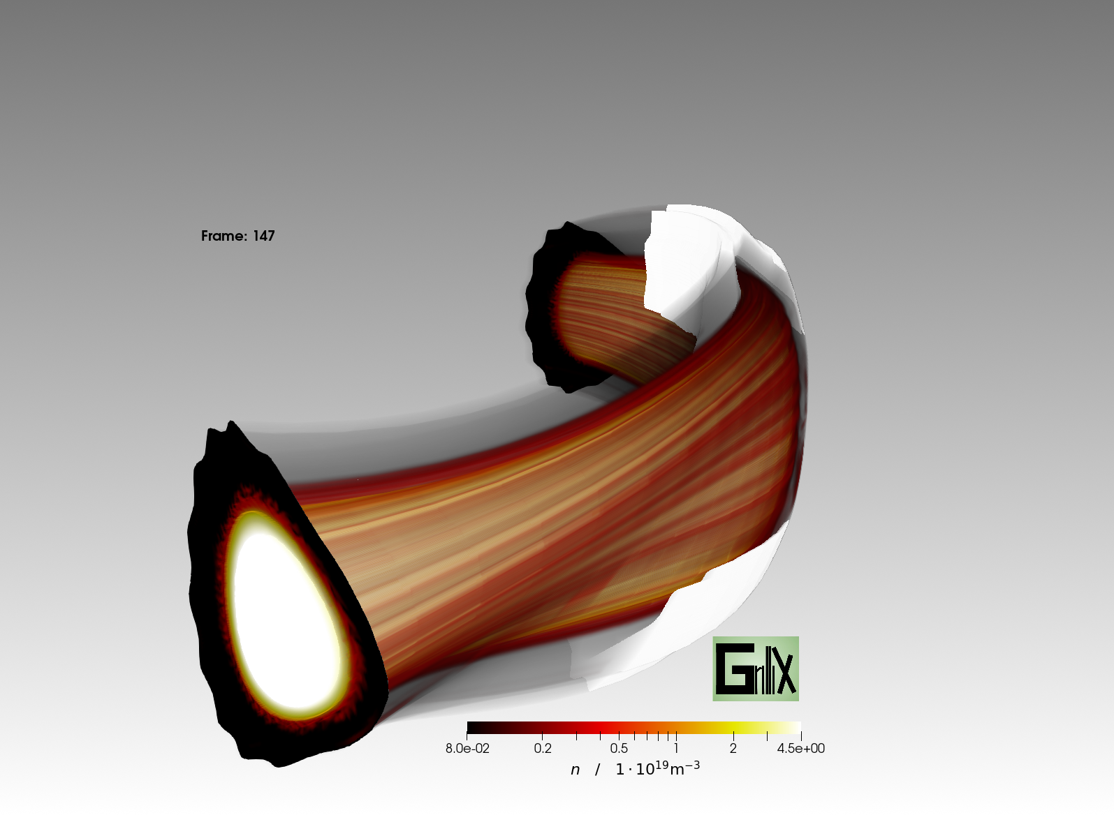 3D visualisation of a GRILLIX simulation of the W7-AS stellarator created with ParaView utilizing the NVIDIA IndeX plugin.